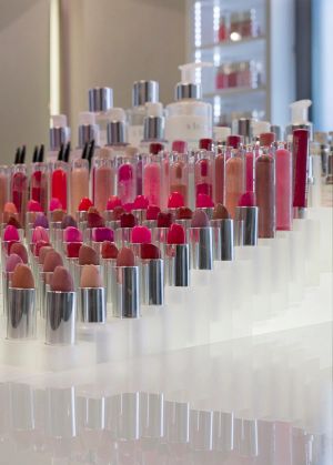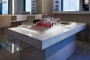 The focus of the interior is the bespoke central display unit – conceived as an undulating ‘landscape’ of makeup displays on back-lit Perspex and CNC-cut to accommodate a prescribed configuration of products.