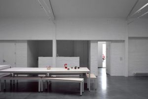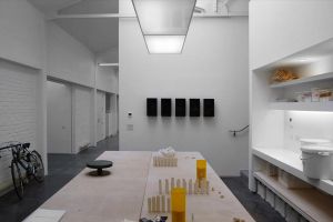 The large industrial space is augmented through a series of new walls, stairs, and mezzanine floor levels, to define a series of separate working areas for de Waal’s team. These include a mezzanine studio where the pots are thrown, and a contemplative area for de Waal’s writing and research, which is on the first floor but connected to the main space by means of a double height void.