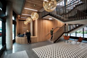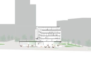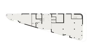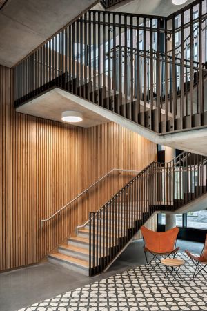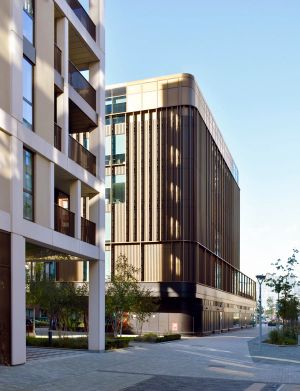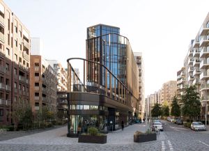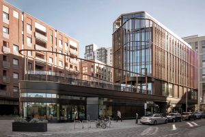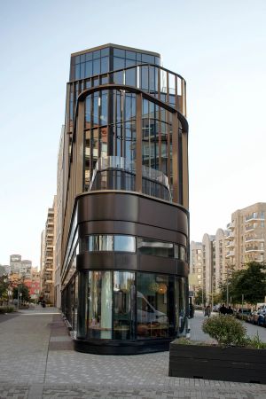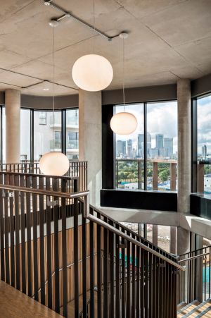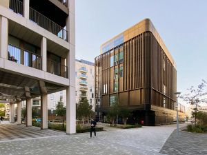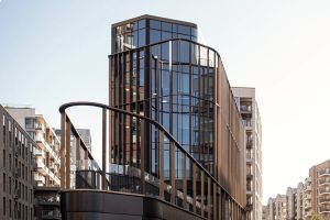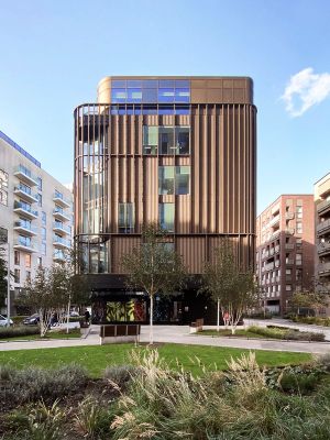 The building’s wedge-shaped form rises five storeys, with prominent and permeable street frontage to all three sides, whilst bespoke glazed façades emphasise its open and welcoming nature. An outer screen of anodised aluminium fins and perforated metal panels wrap around each elevation, both evoking the industrial works that once stood on the site and creating a range of transparencies in response to the activities within whilst opening up views towards the Peninsula.