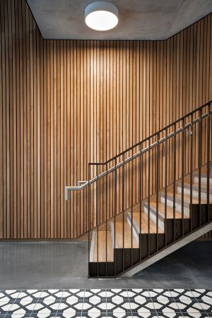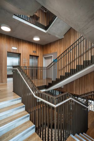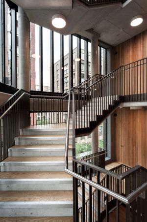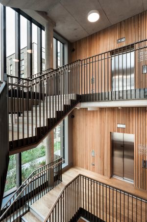The Neighbourhood Building – ‘The Aperture' – is envisaged as a contemporary village hall and comprises a retail unit, café and residents’ lobby on the ground floor, with a crèche, prayer space, estate management and a gym above, all accessible from the shared lobby, and with a dramatic staircase that connects the activities.