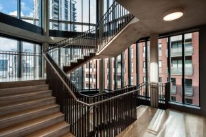 'The Fulmar' provides a tenure-blind mix of affordable and private apartments (60 private, 60 social rent and 19 intermediate) over ten storeys, with a retail unit on the ground floor and residents' rooftop pavilion. It forms three distinct buildings with independent entrances all set around a raised landscaped garden: an important shared space for play and social interaction which overlooks the surrounding streets.