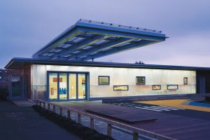 The main studio spaces are flexible and well-lit, and complement the landscaped activity and teaching zones outdoors. Technically, great care was taken to use economic industrial materials to create a sense of quality and unexpected scale, whilst maximising environmental benefits. Both buildings share a family of details whilst maintaining their own distinct identities.