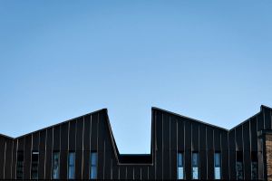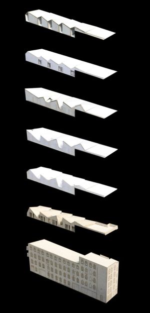 The extension sits lightly on the existing building to crown a building that appeared somewhat incomplete and contributed little to Whitfield Place, creating a new “skyline” inspired by the adjacent butterfly roofs. This roofscape is carved to create terraces which both overlook the public space and allow unexpected views of the sky from below. The proportions, scale, and materiality of the new element are carefully controlled to create a counterpoint to the existing building.