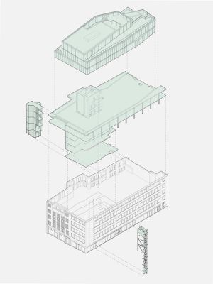 The former building on the site presented itself as a simply detailed, 1950s office development, however, upon further analysis revealed itself to be the amalgamation of five separate phases of development. Adopting an environmentally sustainable approach that was predicated on retention and creative reuse of the existing building, DSDHA's design celebrates the collision of different structures that have been consolidated to create a single building and reveals much of the historic cast-iron structure to bring an integrity and honesty to the character of the internal spaces.