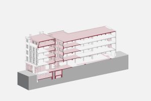 The existing building is extended vertically with three additional floors. Upper floors introduce a series of generous external terraces created through inflecting the form of the roof extension, protecting key views and daylight to the adjacent Altab Ali Park, and addressing the importance of well-being in the workplace.